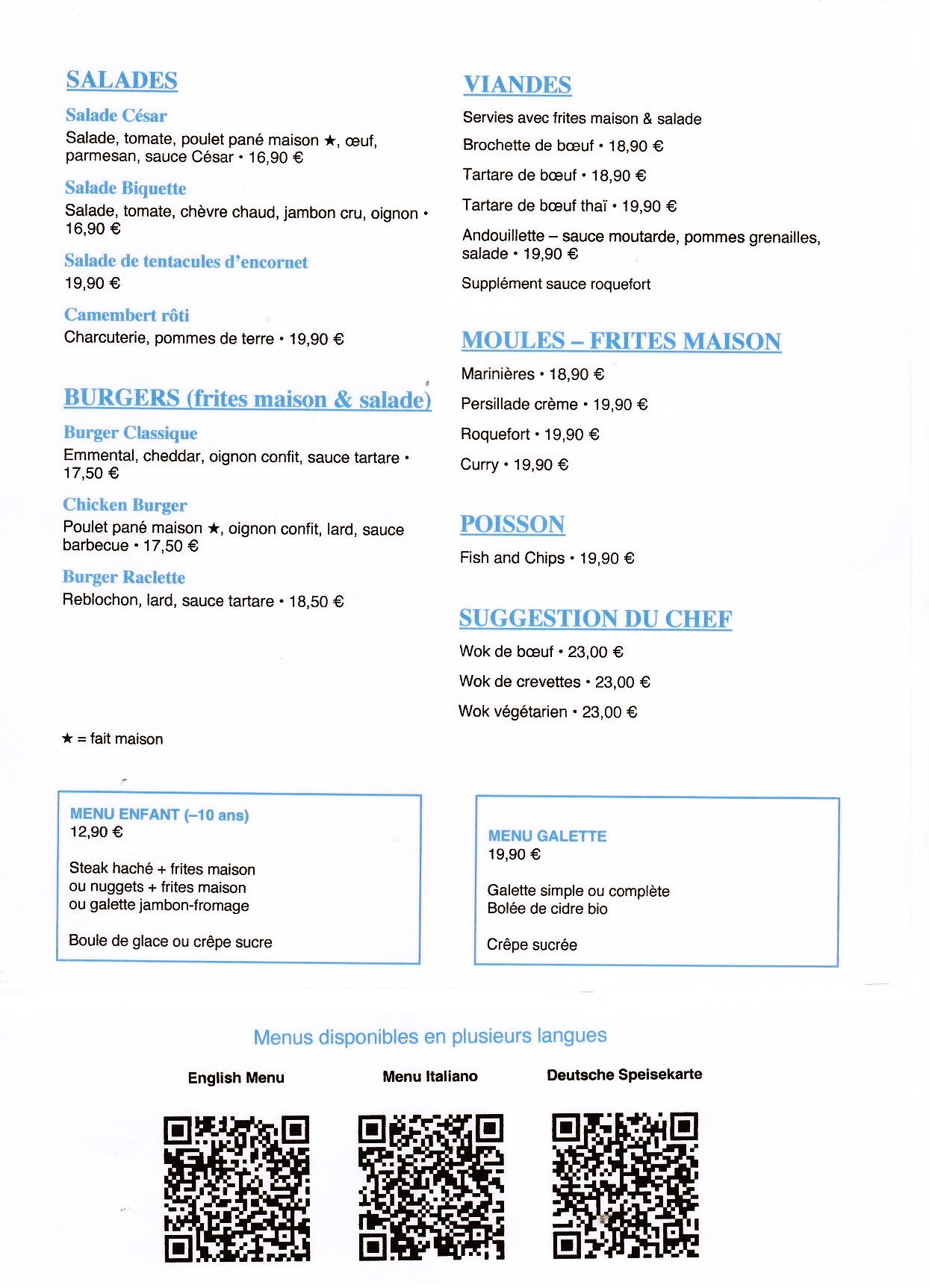 Pour le déjeuner ou le dîner, parcourez la carte de notre restaurant et faites-vous plaisir avec nos salades composées, nos tartares ou nos poke bowls. Retrouvez une sélection de viandes grillées ou de burgers accompagnés de frites maison, sans oublier nos délicieuses galettes de sarrasin.